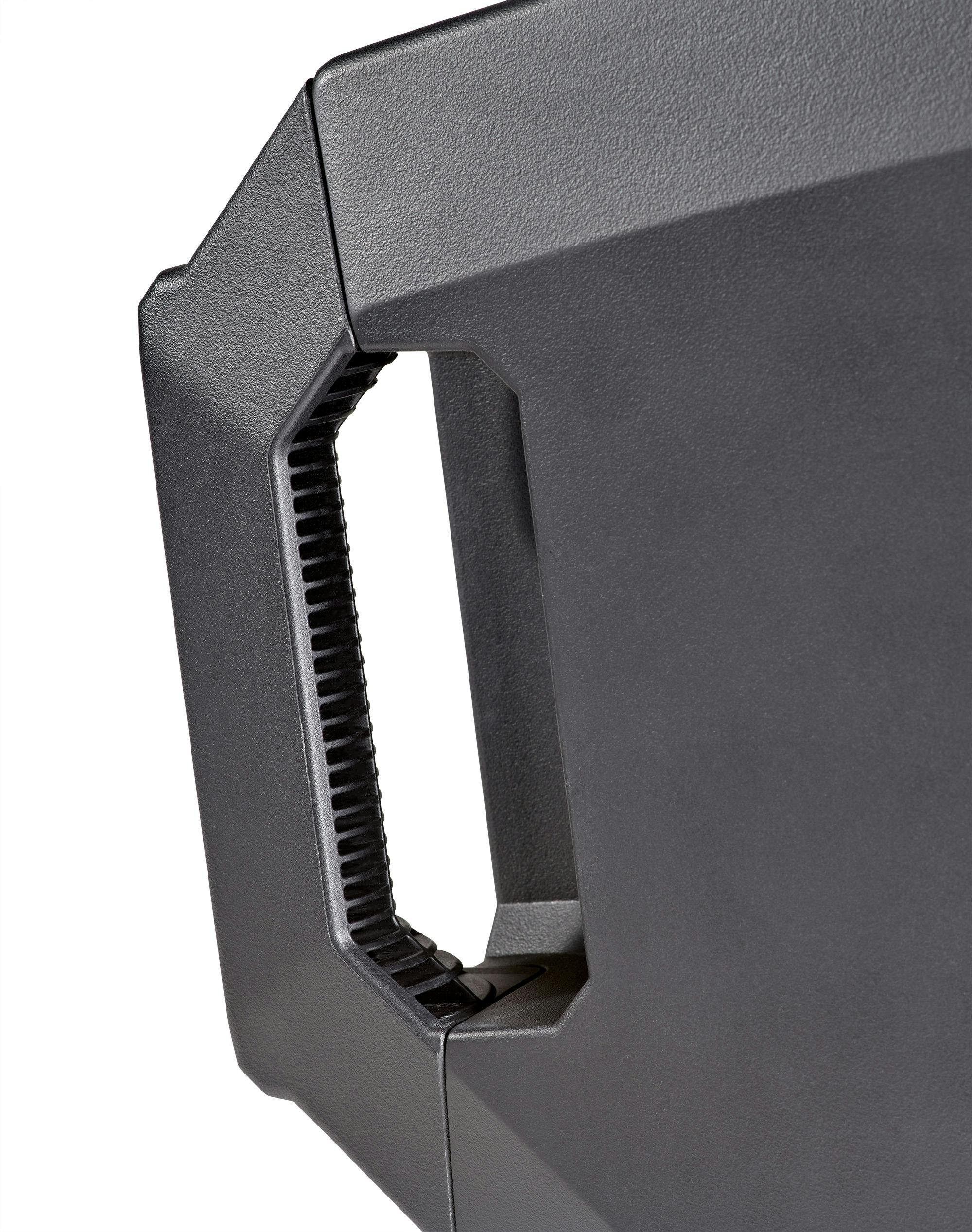 - Design Versatil și Ușor – poate fi folosit în poziție wedge (pe podea), verticală sau montat pe stativ (pole-mounted).