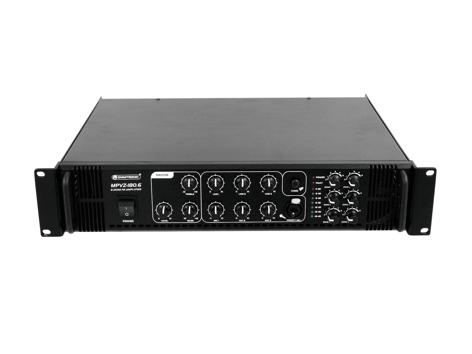 Omnitronic MPVZ-180.6, amplificator-mixer mono cu 6 zone de ieșire și putere de 180W RMS pentru sistemele de adresare publică pe 70/100V sau 4-16 Ohmi: