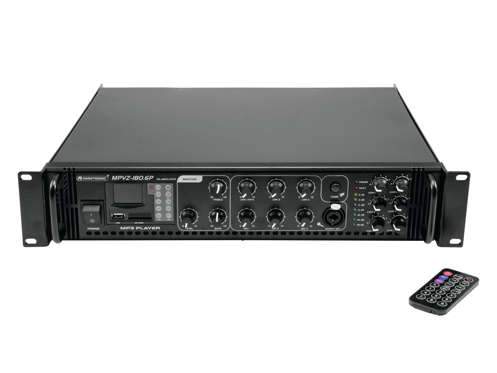 Omnitronic MPVZ-180.6P - mixer cu amplificare cu 6 zone, mono, cu mp3 player și telecomandă IR. Oferă control pentru boxe PA datorită tehnologiei cu 6 zone, prin cele 6 ieșiri ce au fiecare control al nivelelui în 5 trepte. Beneficiază de ieșire master PA oferă 70 V și 100 V, ieșire pentru difuzoare cu impedanță scăzută (4-16 ohmi), MP3 player cu telecomandă IR și ecran backlit LCD albastru. Oferă slot de card SD și port USB. Are funcții de navigare în foldere și funcții de repeat (1, all).
