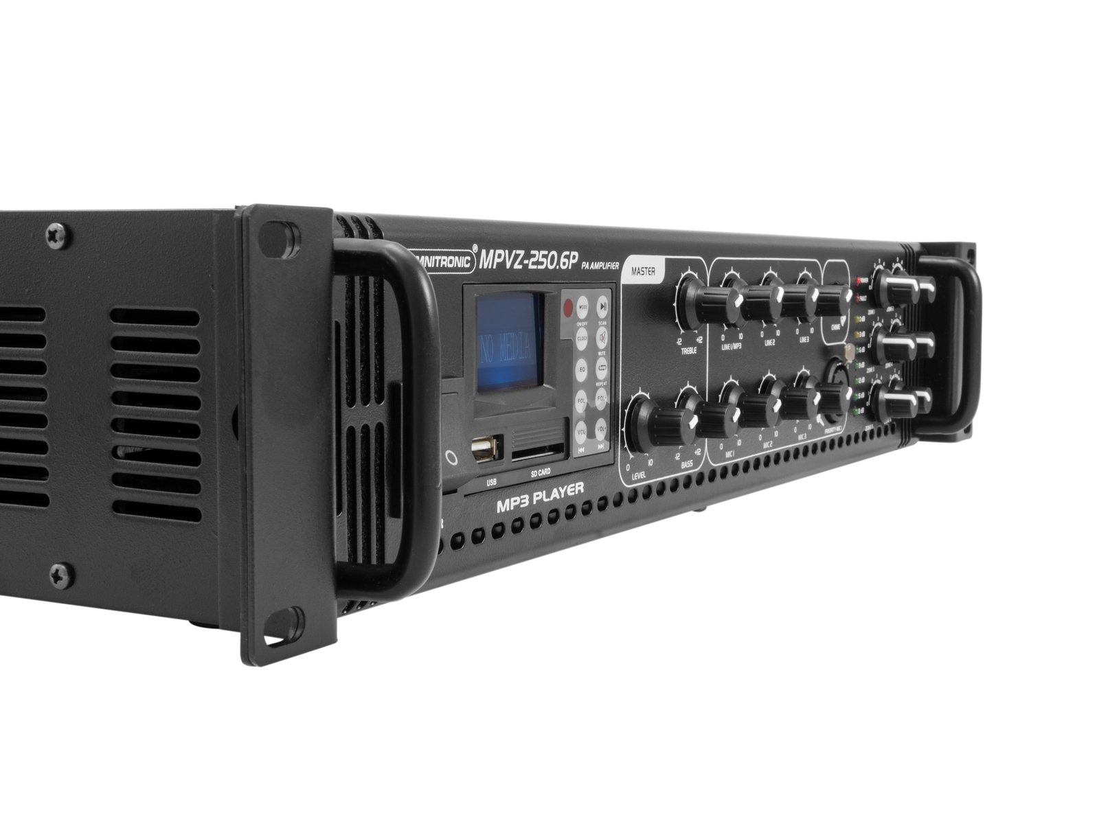 Omnitronic MPVZ-250.6P - mixer cu amplificare cu 6 zone, mono, cu mp3 player și telecomandă IR. Oferă control pentru boxe PA datorită tehnologiei cu 6 zone, prin cele 6 ieșiri ce au fiecare control al nivelelui în 5 trepte. Beneficiază de ieșire master PA oferă 70 V și 100 V, ieșire pentru difuzoare cu impedanță scăzută (4-16 ohmi), MP3 player cu telecomandă IR și ecran backlit LCD albastru. Oferă slot de card SD și port USB. Are funcții de navigare în foldere și funcții de repeat (1, all).