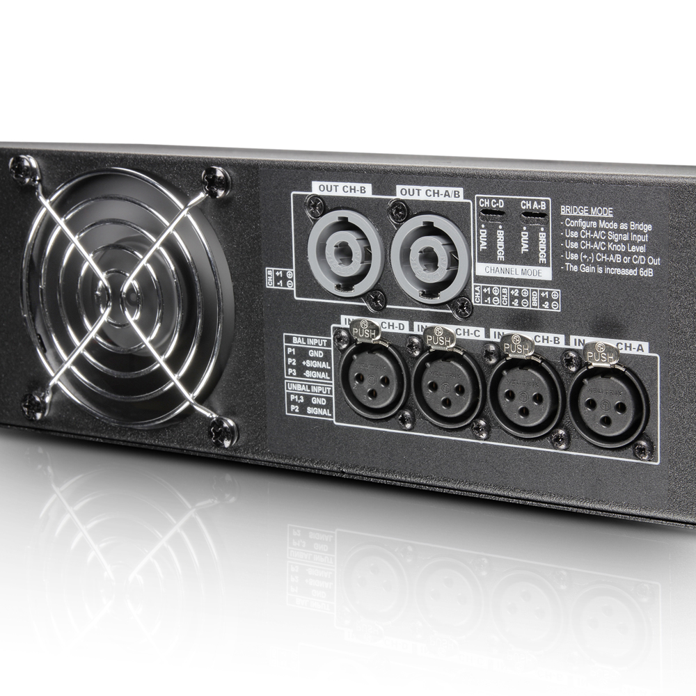 Amplificator 4 canale profesional, topologie clasa H, sursă în comutație QuantaPulse™, clip limiter și multiple protecții integrate, putere de 4 x 1000W la 2 Ohmi, 4 x 1000W la 4 Ohmi, fabricat în UE