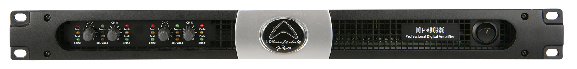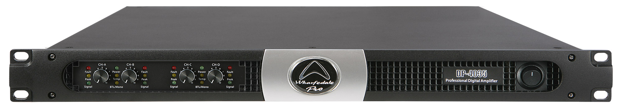 Wharfedale Pro DP-4035, amplificator profesional cu 4 canale pentru sunet live sau instalații. Cu topologie de clasa D și sursă în comutație, livrează putere semnificativă cu distorsiuni minime într-o forma compactă 1U și ușoară de doar 8 kg.