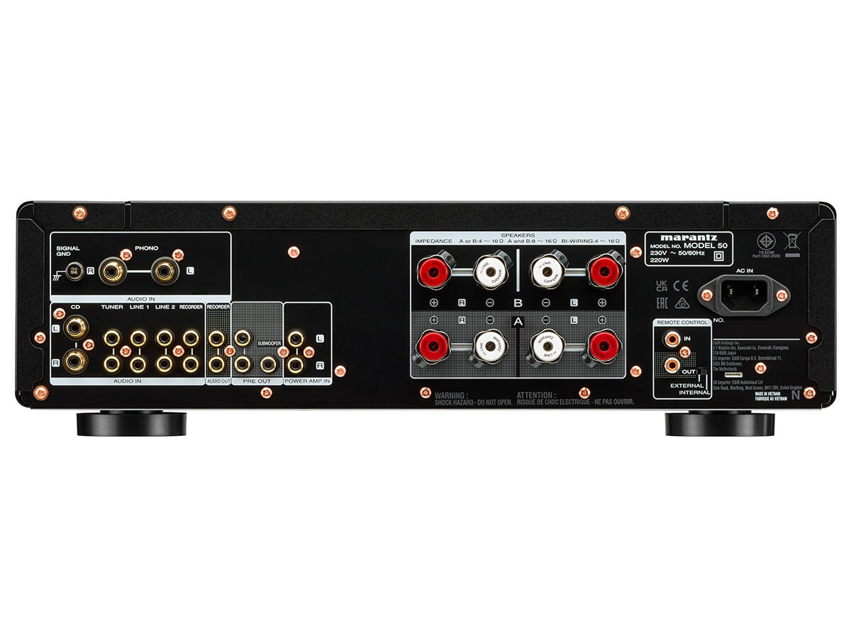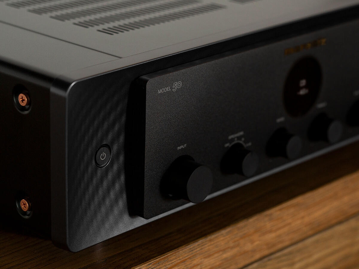 Marantz MODEL 50 - Amplificator integrat stereo proiectat pentru sisteme Hi-Fi analogice. Utilizează o arhitectură de amplificare Class A/B și circuite audio discrete pentru redarea semnalului fără procesare digitală. Permite conectarea mai multor surse analogice, inclusiv pickup și subwoofer.