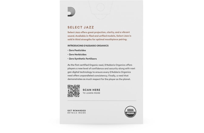 Organic Select Jazz oferă o proiecție excelentă, claritate și un sunet vibrant. Disponibil în modele arhivate și neînregistrate, Select Jazz este vândut în a treia concentrație pentru o asociere optimă a muștiucului . Fiecare ancie din pachet vine sigilată într-un suport de trestie de hârtie reciclabilă și o folie de flux.