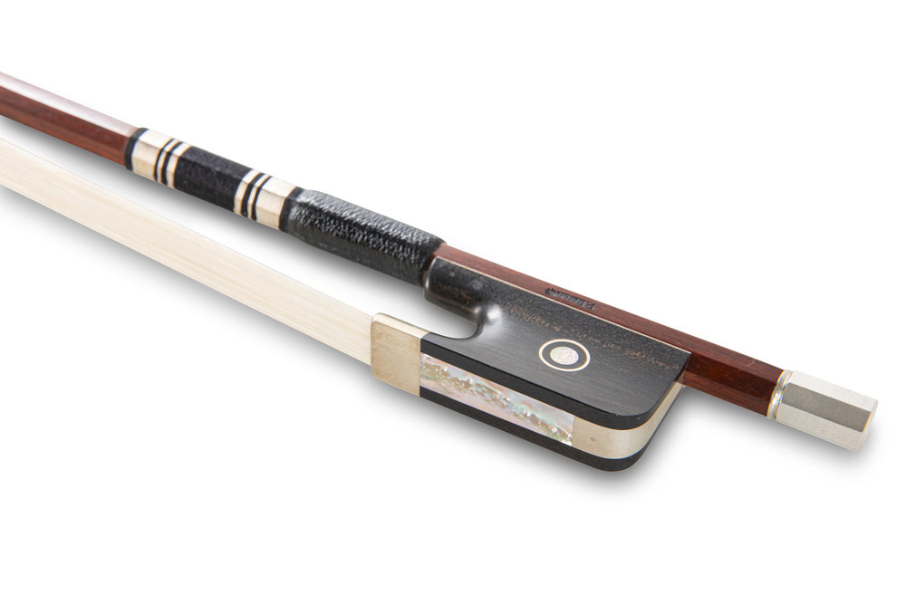 Arcuș din Pernambuc calitatea întâi, rotund , Mammoth head plate, broască abanos selecționată cu ochi parisian, piciorușe Sartory din argint, dintr-o bucata, filat cu argint, cel mai fin cu mătase franceză. Timbrat "P. Baron*".
