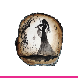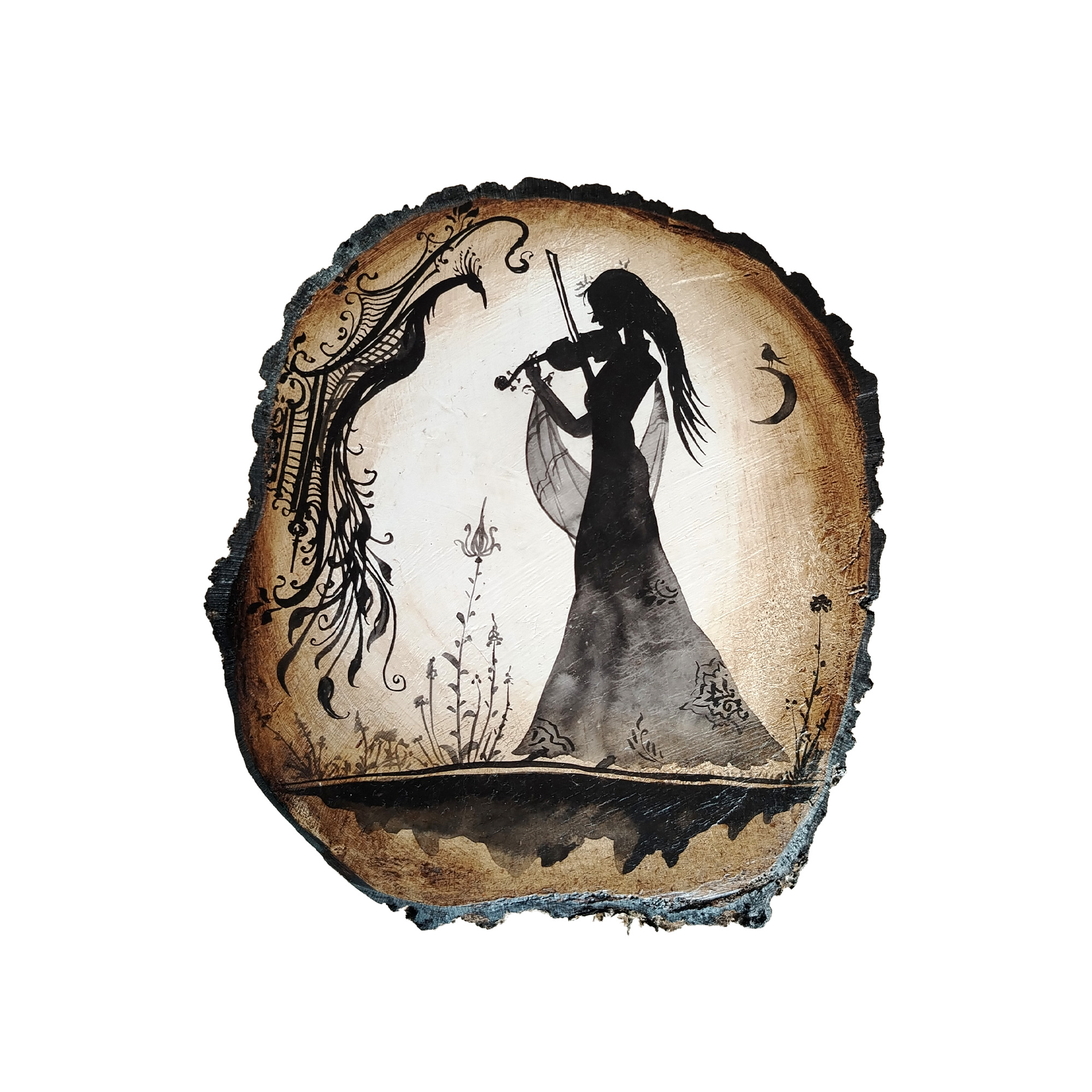 Pictură pe lemn – Fată la vioară cu păun I 19 x 17 - Pictură pe lemn antichizat, realizată în 2025 de către Bajko Attila.