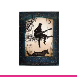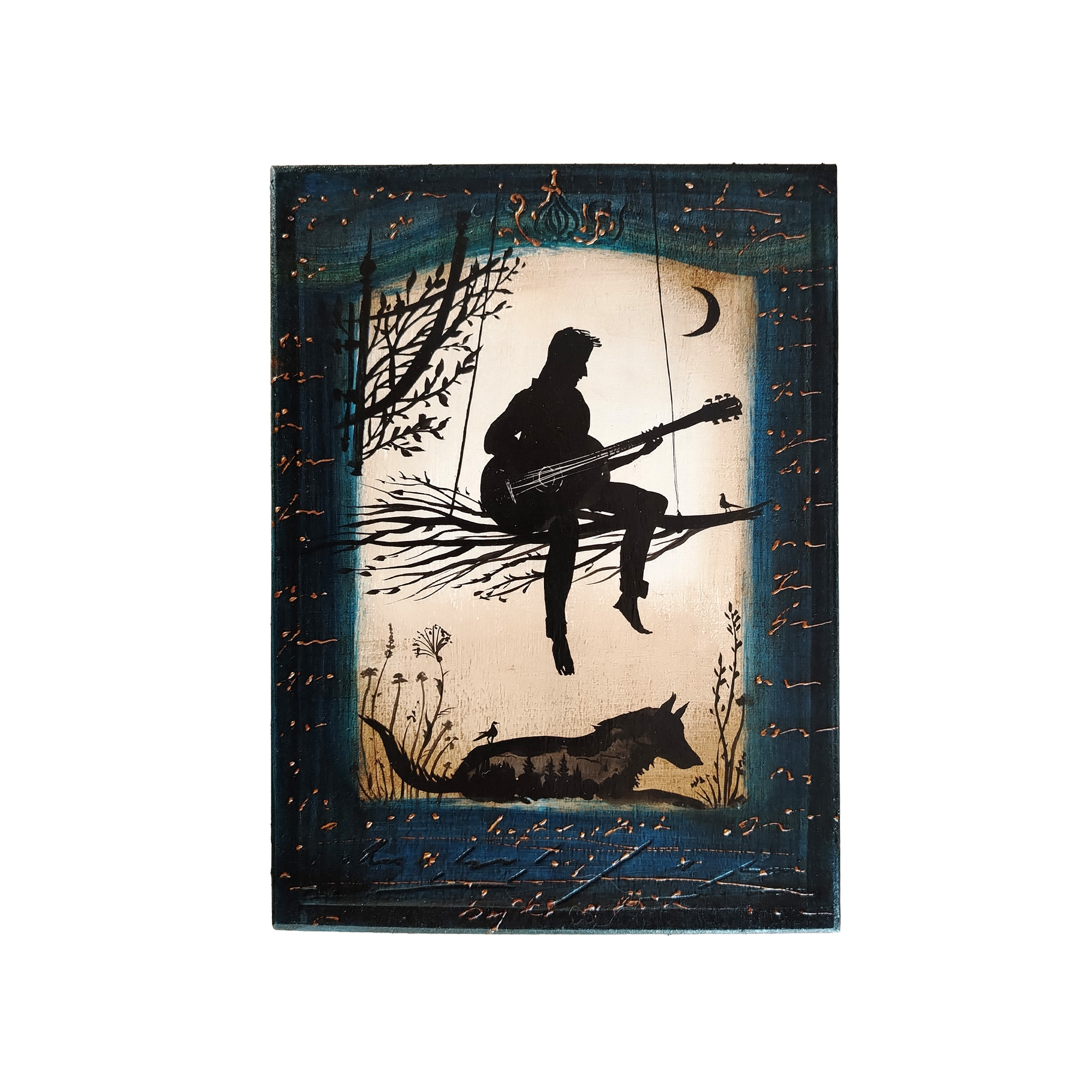 Pictură pe lemn – Chitarist cu lup I 20 x 15 - Pictură pe lemn antichizat, realizată în 2025 de către Bajko Attila.