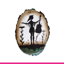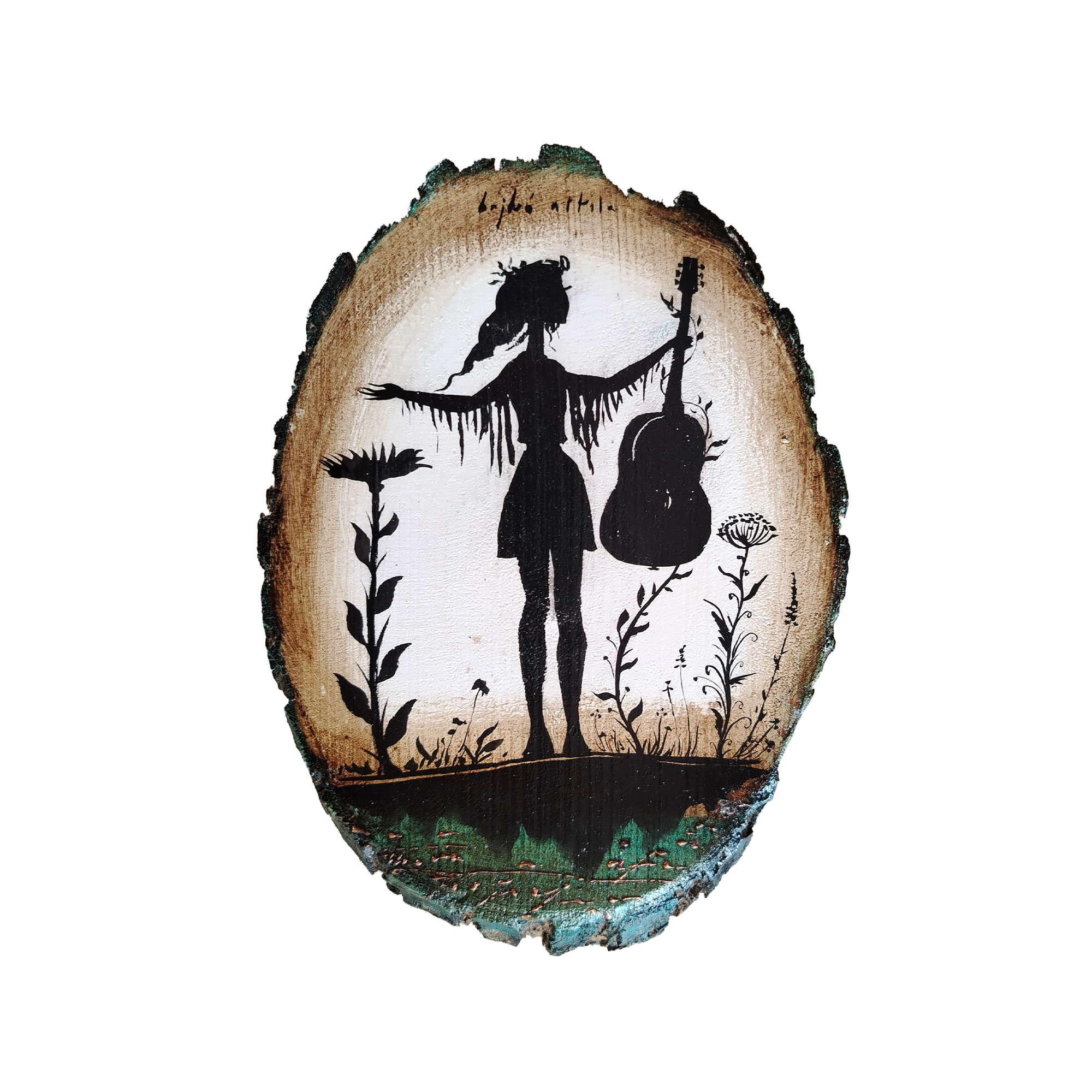Pictură pe lemn – Fată cu chitara printre flori I 18 x 13 - Pictură pe lemn antichizat, realizată în 2025 de către Bajko Attila.