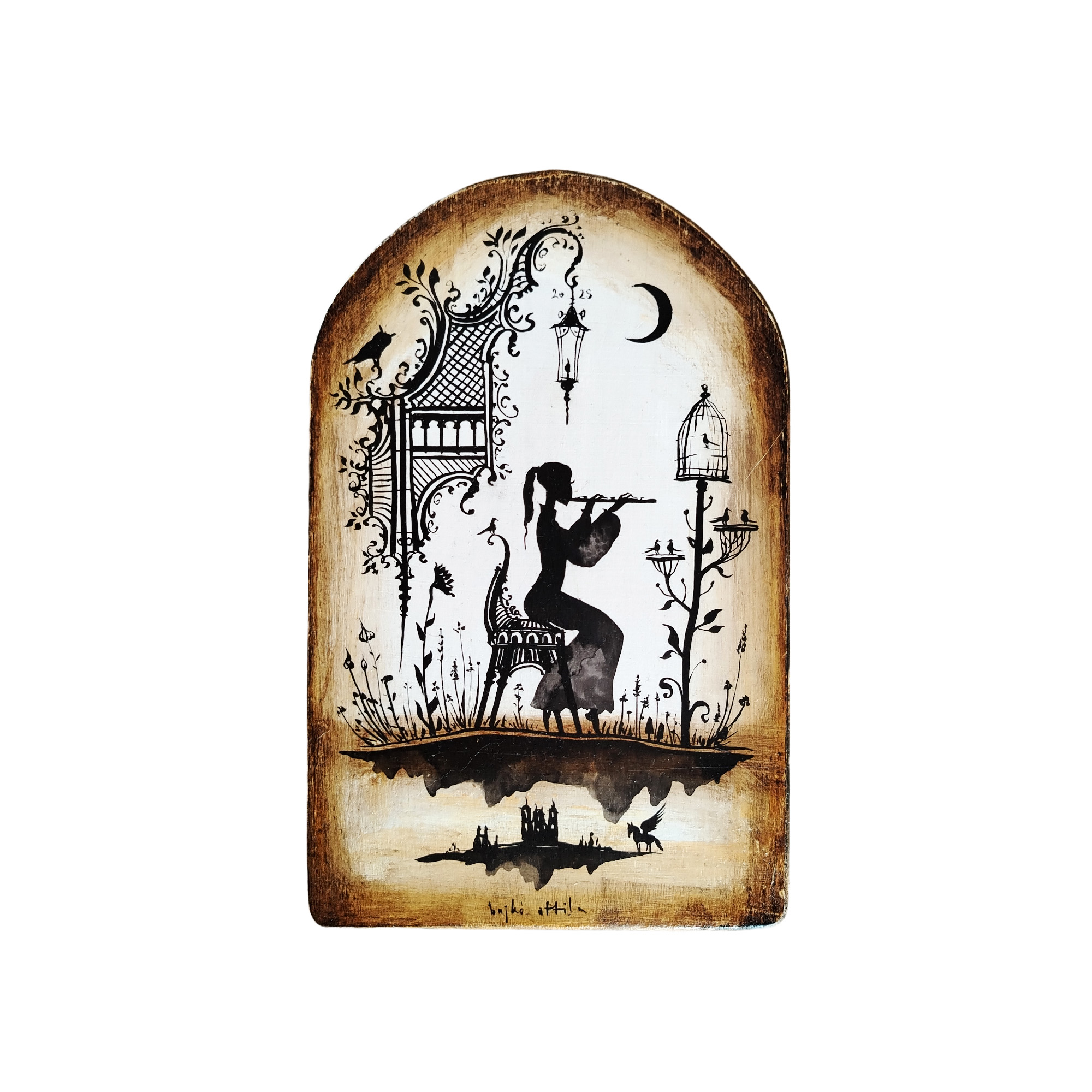 Pictură pe lemn – Fată cu flaut și pasăre I 22 x 14 - Pictură pe lemn antichizat, realizată în 2025 de către Bajko Attila.