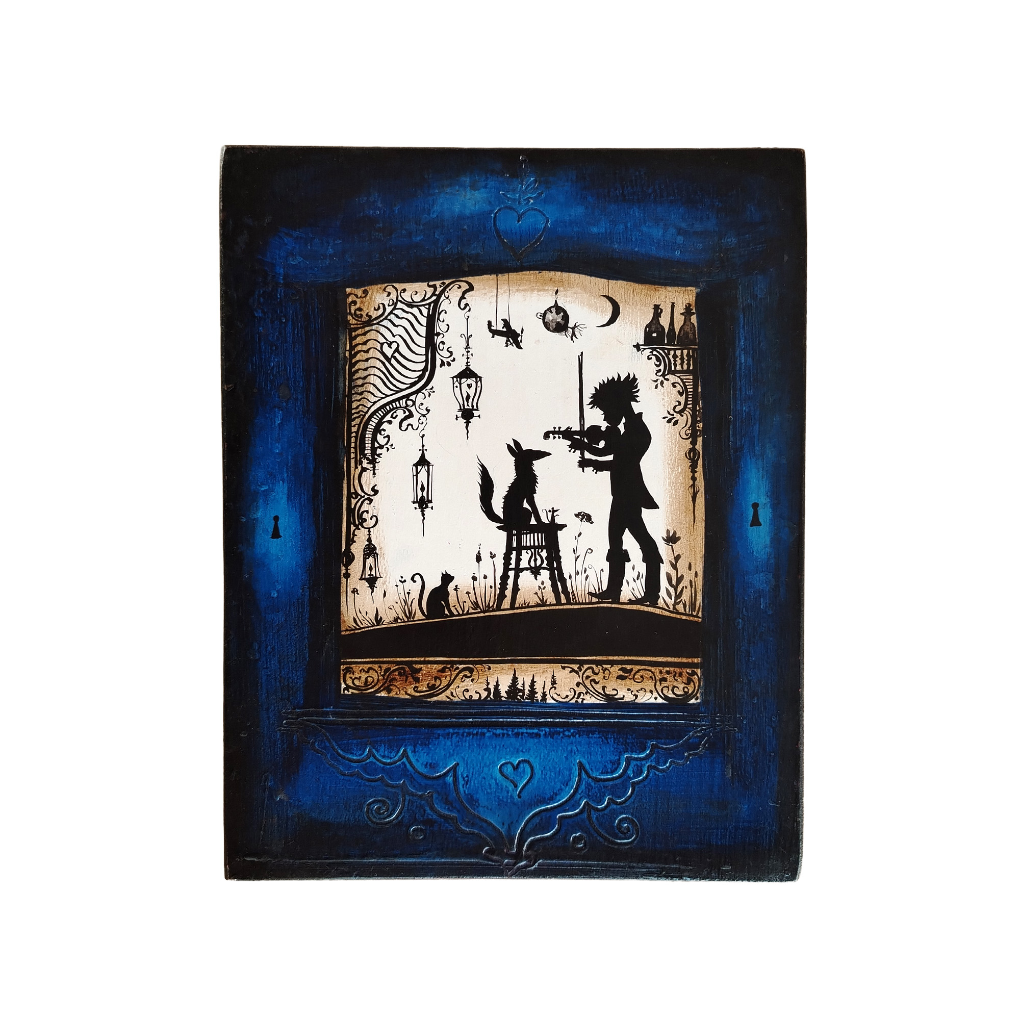 Pictură pe lemn – Violonist cu vulpe și pisică I 26 x 20 - Pictură pe lemn antichizat, realizată în 2025 de către Bajko Attila.