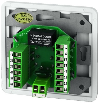 Selector program dintre 6 surse. Releu încorporat pentru comutarea în circuit de 24V prioritar. Panou și buton în culoare albă. Incastrabil în perete iîn doză standard de 60mm sau aplicabil în carcasă Monacor ATT-300. Adâncime de montare: 35mm.