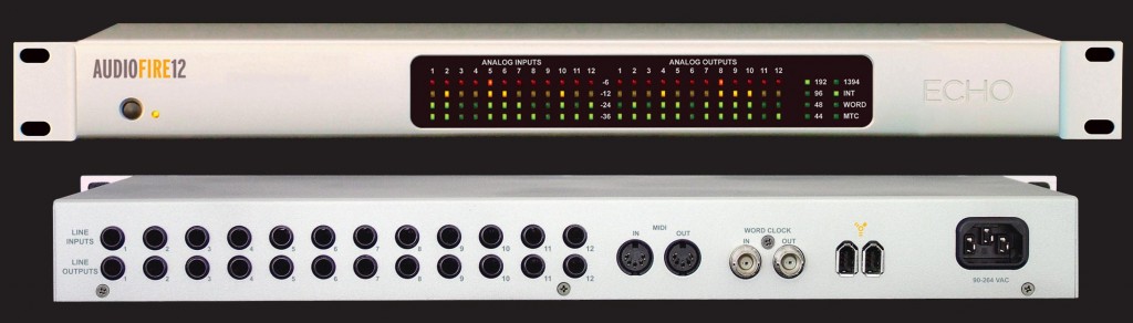 Pentru cei care doresc mai multe intrari si iesiri analoage, ECHO AudioFire 12 este ideala. Simpla in specificatii, cu 12 intrari si iesiri pe partea din spate [numai butonul on/off si panoul de leduri se afla pe fata – ceea ce ii da o eleganta si un rafinament vizual deosebit, profesional], world clock in/out, mufele de MIDI in/out, o pereche de porturi Firewire si… atat. Nimic mai mult. La inceput, cand am scos-o din cutie, simplitatea ei [obisnuit cu synthurile cu fadere, butoane, displayuri etc etc] m-a izbit la moral, fiind oarecum dezamagit, in comparatie de exemplu cu MOTU 8PRE sau Focusrite Saffire PRO40 – a caror panou frontal este populat de potentiometre rotative, „mufe fufe si alte alea”!