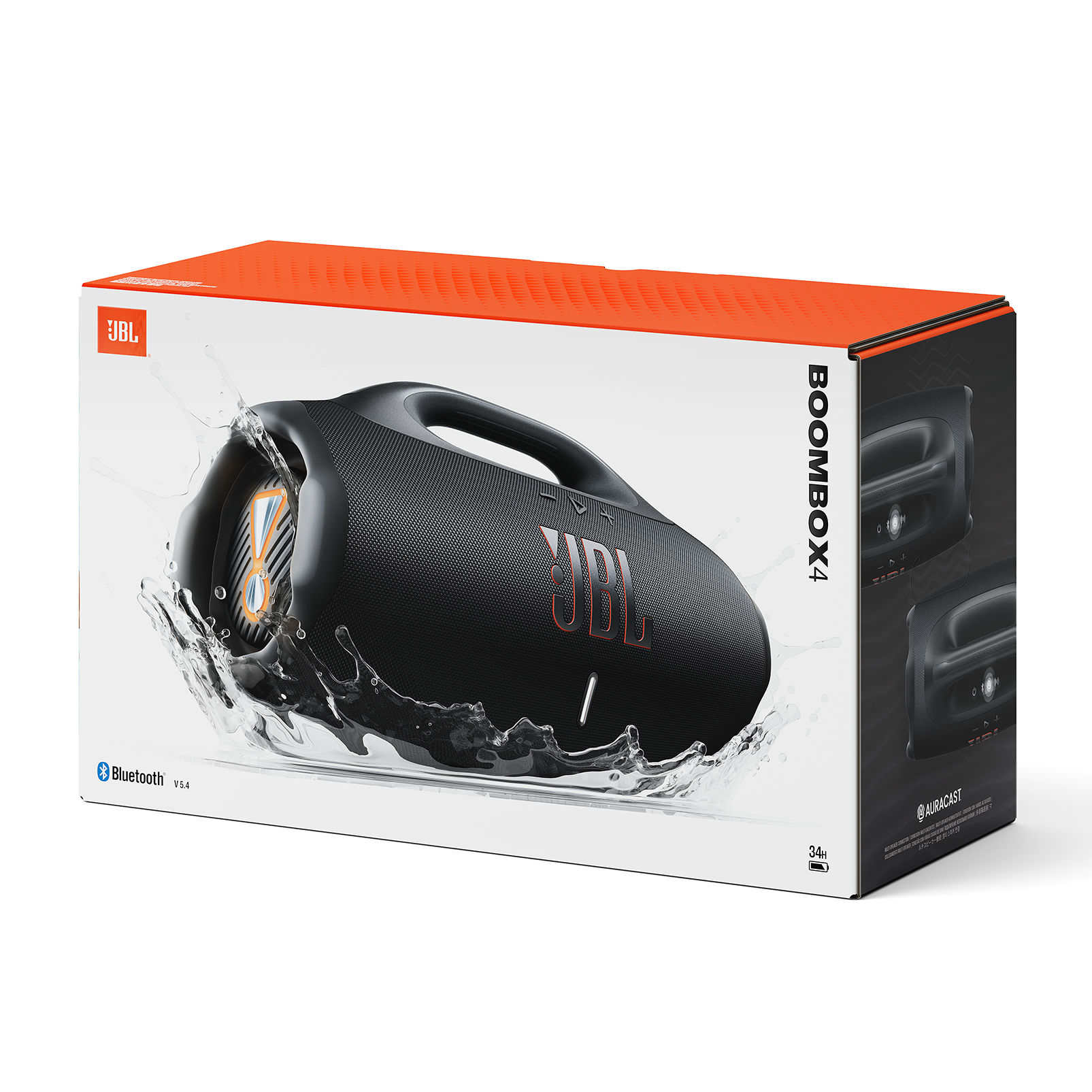 JBL Boombox 4 Black - Boxă Bluetooth portabilă, cu sunet clar, bass profund și autonomie de până la 34 de ore. Tehnologia AI Sound Boost optimizează redarea în timp real, iar designul nou este mai mare, dar mai ușor, perfect pentru petreceri oriunde. Este complet rezistentă la apă și praf (IP68) și oferă conectivitate Bluetooth și control prin aplicația JBL Portable.