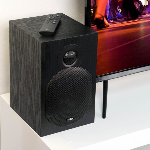 Plus 2.1 Black - Pereche de boxe active de tip Bookshelf, cu putere 2 x 35 W, cu difuzor de bass de 100 mm și tweeter de 32 mm, Bluetooth, Wi-Fi, perfecte pentru PC, studio, sisteme de DJ, TV, finisaj: negru. Include aplicația gratuită Tibo app care cuprinde compatibilitate cu Spotify, TIDAL, Napster, Tunein, iHeartRadio si o telecomandă Tibo pentru controlul sistemului de sunet de la distanță.