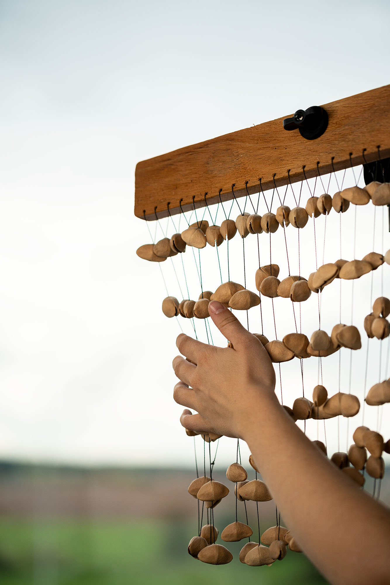 Coji de nuci de semințe de kenari, atașate la o bucată solidă de mahon, creează un instrument unic și versatil.