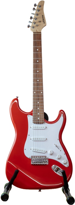 Arrow Tonecaster ST 111 Diamond Red Rosewood/White – Chitară electrică în stil Stratocaster, de culoare roșu lucios, cu pickguard alb. Corpul este din plop, în timp ce gâtul din arțar canadian este echipat cu o tastieră din Palisandru, iar cele 3 doze single-coil sunt ideale pentru versatilitate tonală. Chitara are un cutaway asimetric care face să fie ușor și confortabil să ajungi chiar și la cele mai înalte freturi.