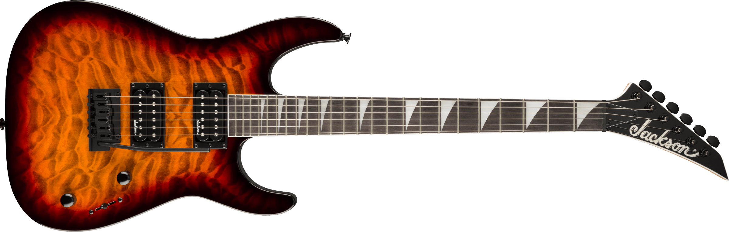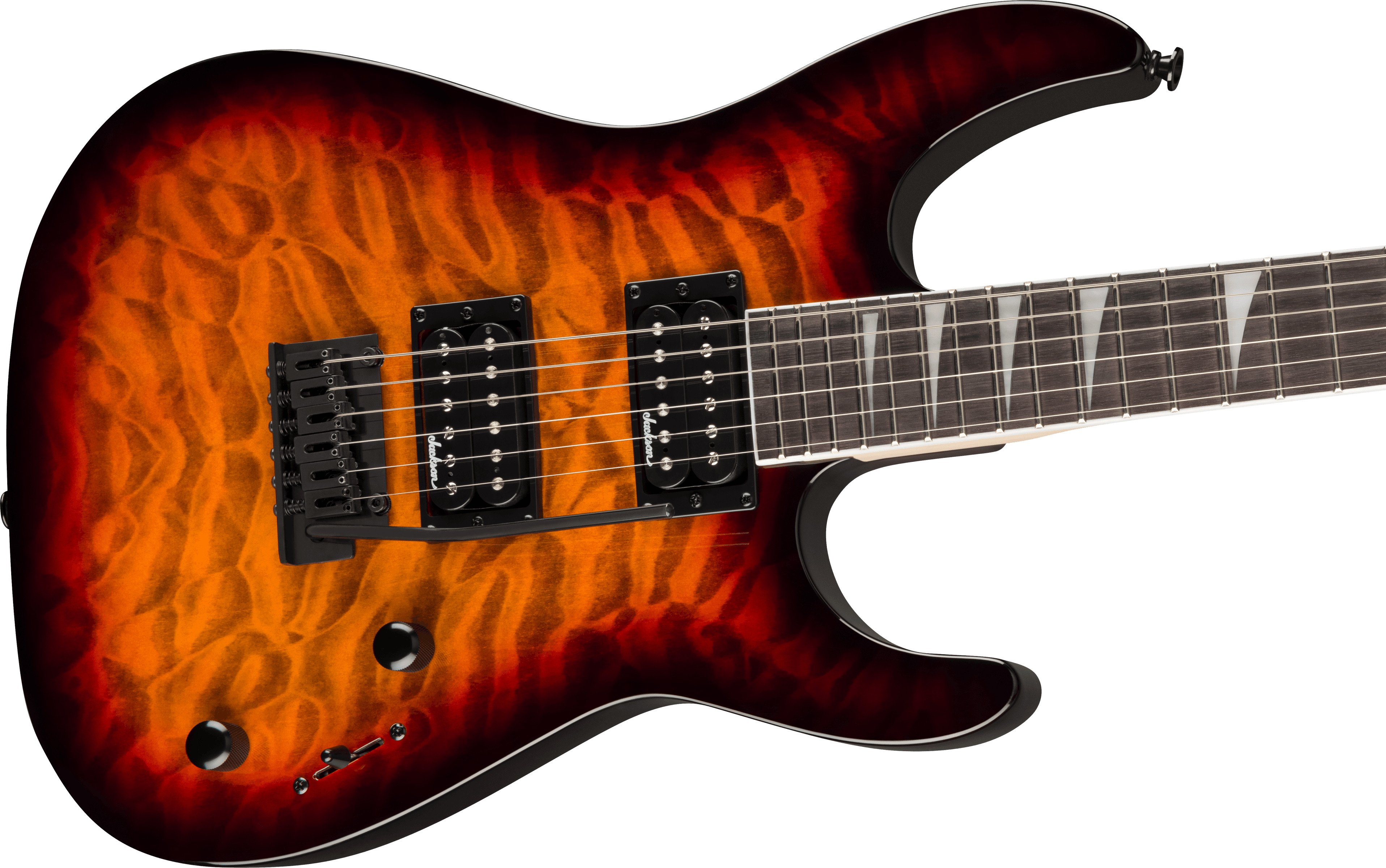 Jackson JS20 DKAQ 2PT - Chitară electrică cu corp din plop și top din arțar quilt, echipată cu 24 de taste jumbo, potrivită pentru riff-uri rapide și pasaje tehnice. Construcția bolt-on și ranforsarea cu grafit oferă stabilitate și control în acordaj.