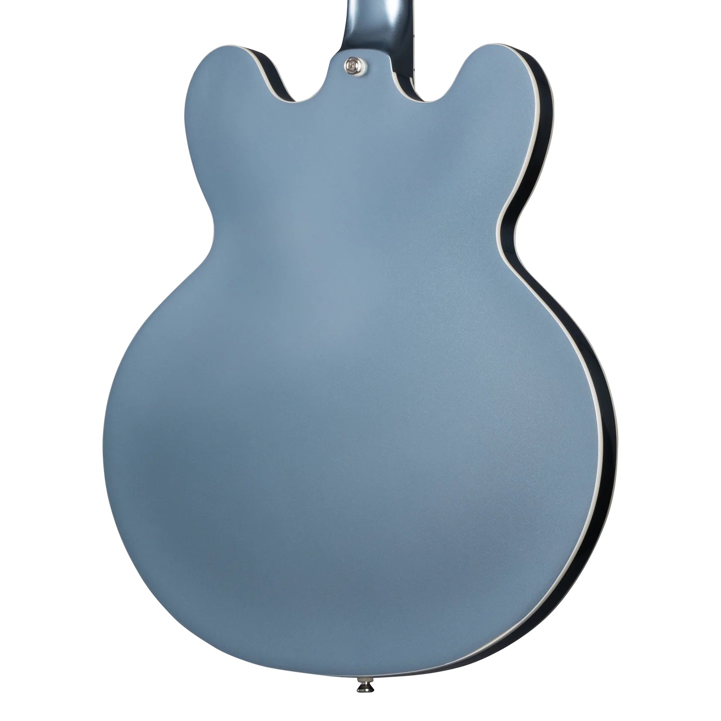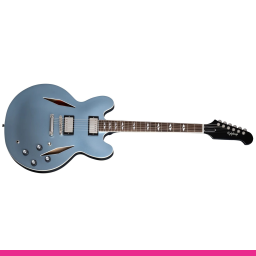 Epiphone Dave Grohl DG-335 (Incl. Hard Case) PE Pellham Blue - Chitară electrică semi-hollowbody creată în colaborare Dave Grohl și Gibson Custom Shop. Corpul în formă ES-335 cu găuri de rezonanță în formă de diamant, gâtul dintr-o singură bucată de mahon cu profil C eliptic și tastiera din laur cu 22 de taste cu inlay-uri tip diamant despicat, completează aspectul iconic al instrumentului.