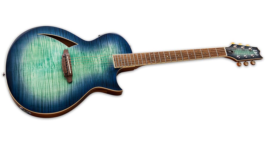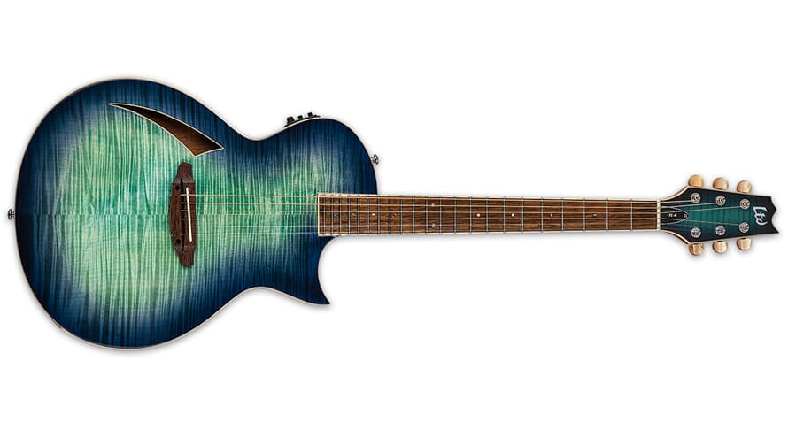ESP LTD TL-6 AQMB - Chitară electro-acustică cu 6 corzi, design modern stilizat și construcție de tip ”Set-Neck”. Vine echipată cu electronică activă Fishman, 22 de taste jumbo și cheițe Grover.