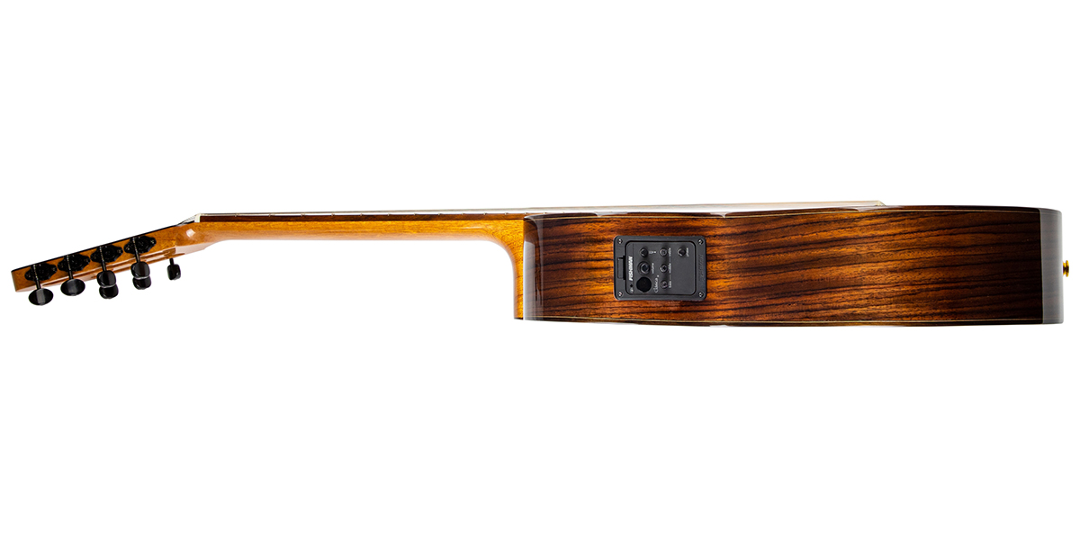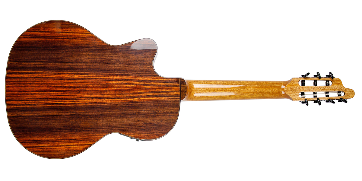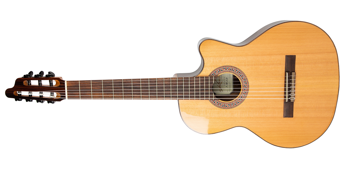 Construcția handmade, cu față din cedru masiv occidental și spate și laterale din palisandru indian masiv, generează un ton cald și rezonant, ideal pentru jazz, flamenco, fusion sau muzică tradițională. Cutaway-ul venețian facilitează accesul la pozițiile superioare, iar finisajul subțire din poliuretan păstrează vibrația naturală a lemnului.