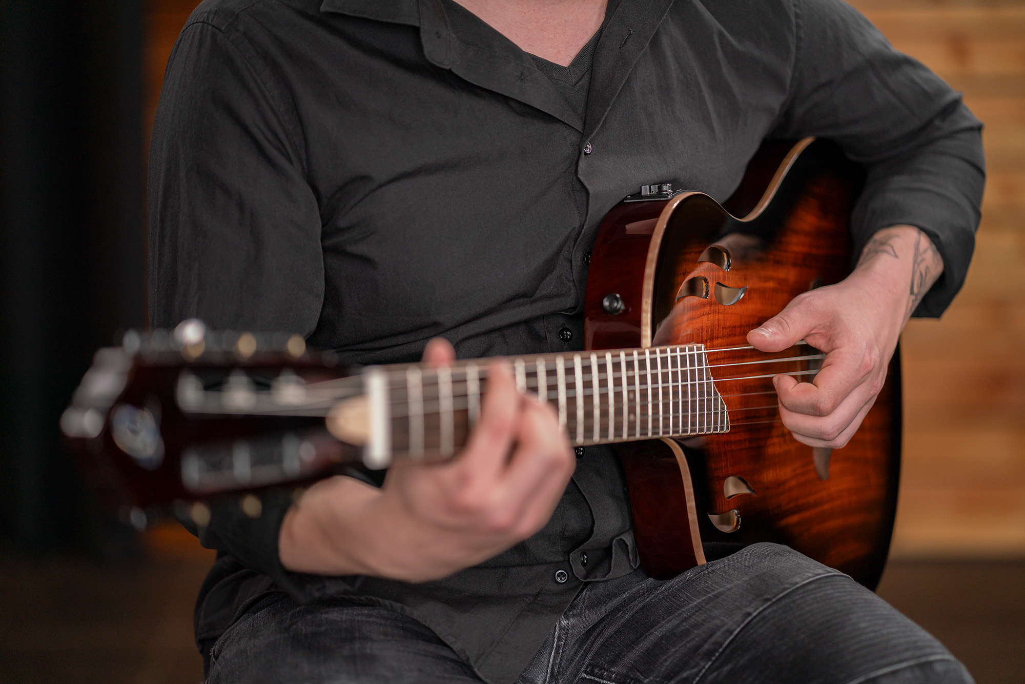 Realizat meticulos, cu precizie, TourPlayer are un corp solid Okoume cu camere goale, oferind greutate redusă și rezonanță îmbunătățită pentru o fundație de sunet plină și expresivă. Blatul este disponibil în Acacia, Flamed Maple sau