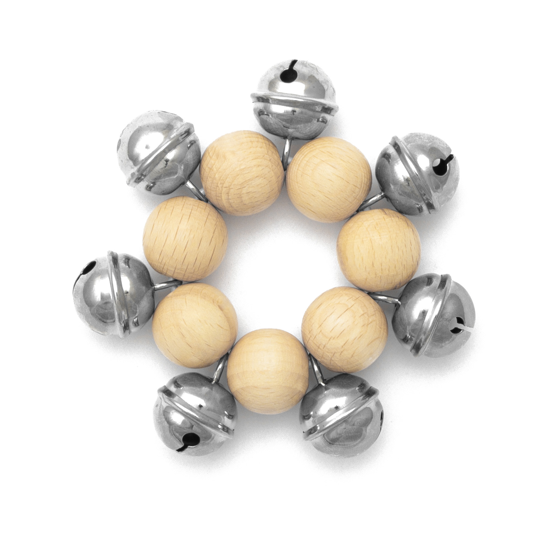 Brățară elastică pentru gleznă cu clopoței, realizată din șapte bile de lemn de fag netratat și șapte clopoței metalici cu sunet strălucitor. Cu o circumferință de 10 centimetri, este un accesoriu grozav pentru joacă și dans.