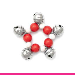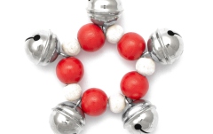 Brățara elastică cu clopoței este compusă din cinci bile mari și cinci mici din lemn colorat, alături de cinci clopoței care sună clar. Diametrul brățării este de 9 centimetri.