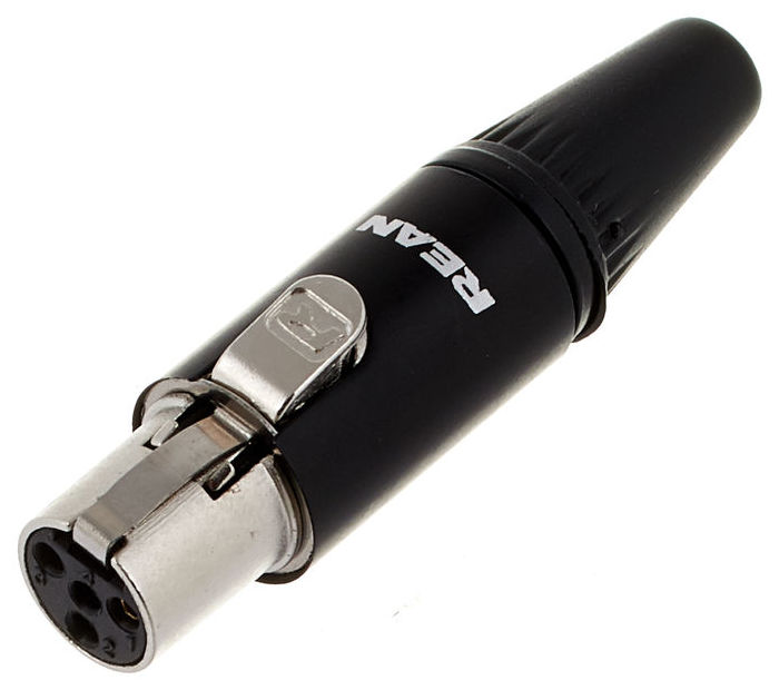 Neutrik Rean RT4FC-B - conector mini XLR mamă cu 4 pini, cu carcasă metalică neagră, contacte placate cu aur. Ușor de asamblat, beneficiază de un sistem de ecranare care oferă imunitate crescută la zgomot rezidual, și oferă protecție EMI. De asemeni beneficiază de sistem de blocare, compatibilă cu cabluri cu până la 4 mm diametru, și sunt prevăzute cu ghidaj pentru introducere corectă și împiedicarea răsucirii nedorite.