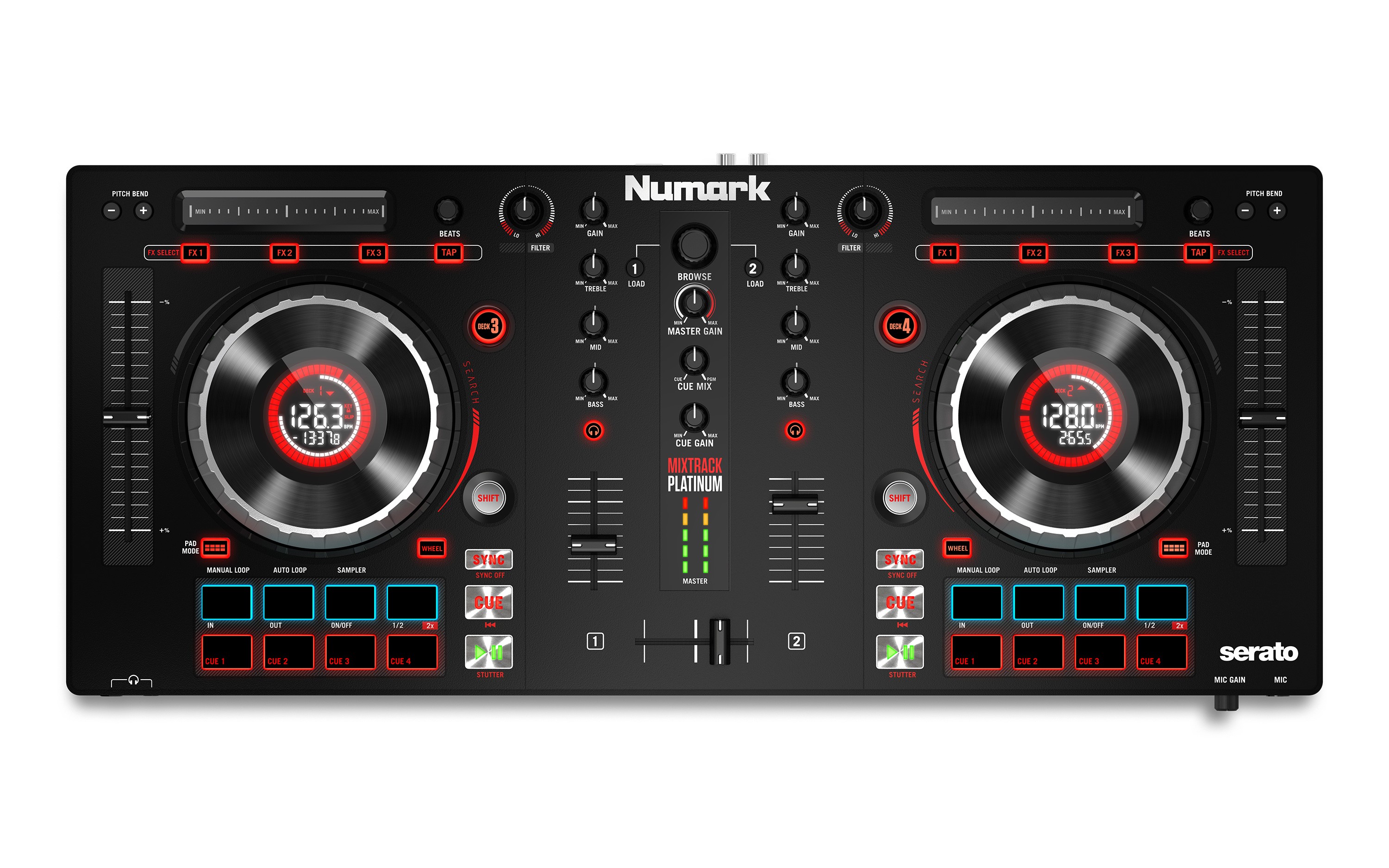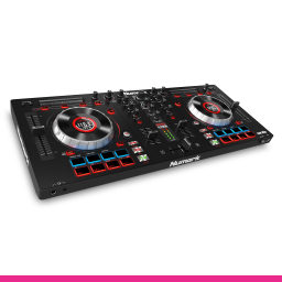 Numark Mixtrack Platinum - consolă DJ cu 2 canale, placă de sunet pe 24 biti, joguri inteligente cu display-uri de 1.75" pentru diverse informații și pitchuri de 100mm, capabilititatea de a mixa pe 4 canale, filtre și gain pentru fiecare canal, efecte și ieșire pe 24bit. Pe displayurile de 1.75 inch se pot monitoriza bpm-ul, poziția jogului, timpul rămas, key-ul, pitch-ul, și afișează informațiile importante. Oferă filtru pe fiecare deck, aceleași fadere de pitch de 100mm cu care se poate controla foarte precis tempo-ul, iar jogurile de metal sunt capacitive și dual zone. Oferă posibilitatea de a face scratchuri doar atingand jogul sau de a modifica pitchul manipulând jogul din exterior. Pachetul include 6 pachete de sampleuri de la PrimeLoops, adică peste 380 de loopuri premium, drum kituri, etc.
