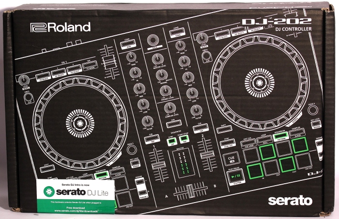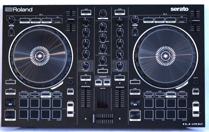 Roland DJ-202 - controler DJ cu 2 canale, controller Serato Intro cu 4 deck-uri, care moștenește capacitățile avansate ale DJ-808, și oferă o multitudine de caracteristici într-o unitate solidă și portabilă ideeală pentru aplicații mobile. Acesta oferă 2 platter-e mari, pad-uri dedicate și controale de transport, un sequencer incorporat și o intrare de microfon cu efecte profesionale pentru voce. Se alimentează prin USB, și oferă o rezoluție de sunet de 24-bit/ 48 kHz. Platanele oferă o performanță cu latență scăzută pentru scratch și cuing, iar controalele dedicate Serato DJ permit creearea și accesarea rapidă de hot cues, loops, și sample-uri, plus selectarea dintre 4 deck-uri cu butoane dedicate DEck Select. Fiecare canal beneficiază de un potențiometru de trim, control EQ pe 3 benzi, controale de filtre high/low, și un fader de nivel, în timp ce secțiunea master oferă potențiometre pentru volum master, cue/master mixing, volum căști, volum sampler, și un crossfader pentru tranziții line între deck-uri. De asemeni mai beneficiază de 3 butoane de selecție Serato FX pentru fiecare deck pentru controlul efectelor Serato's on-board FX.