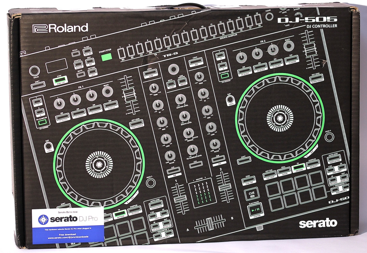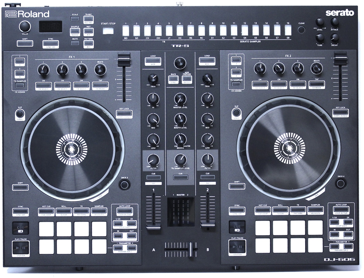 Roland DJ-505 - controller DJ profesional, cu 2 canale, controller Serato cu 4 deck-uri, care combină capacitățile avansate ale Serato DJ cu sunetele și sequencing-ul drum machine-urilor Roland TR-808, TR-909, TR-606, și TR-707, făcând să fie ideeal pentru DJ, performanțe live, petreceri, cluburi sau baruri. Beneficiază de o interfață audio incorporată cu rezoluție de 24-bit/ 48 kHz, două seturi ieșiri master ce includ conectori XLR și RCA, în timp ce ieșirea de booth este oferită pe 2 conectori balansați jack 1/4". Adițional, beneficiază de 2 ieșiri de căști cu conectori jack 1/4" și 1/8" ce permit utilizarea a două perechi de căști simultan. Pe lângă toate acestea, beneficiază de o intrare de microfon cu conector 1/4", ce permite conectarea unui microfon sau chiar instrument, putând utiliza pentru acestea și efecte precum gate, hi-pass filter, reverb, sau echo.