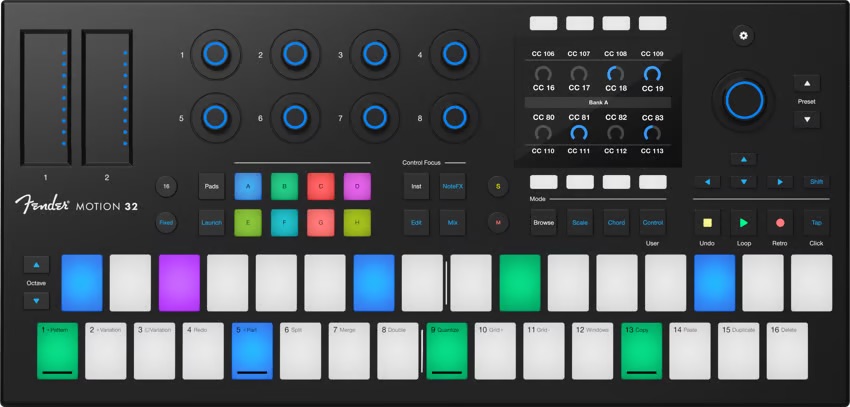 Fender Motion 32 – Controler MIDI cu 32 pad-uri RGB, proiectat pentru producție muzicală și performanță live.