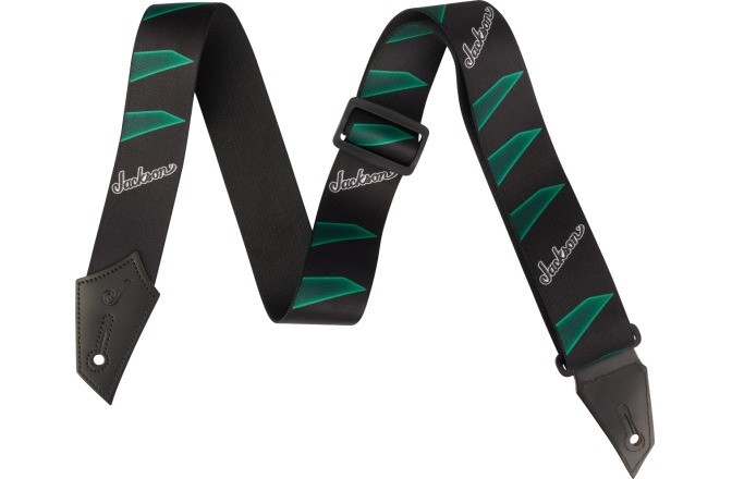 Această curea de chitară din polietilenă neagră are un model ascuțit Jackson®, precum și capete din piele în forma suportului. Disponibil în patru combinații de culori - negru cu albastru, negru cu verde, negru cu violet și negru cu roșu.