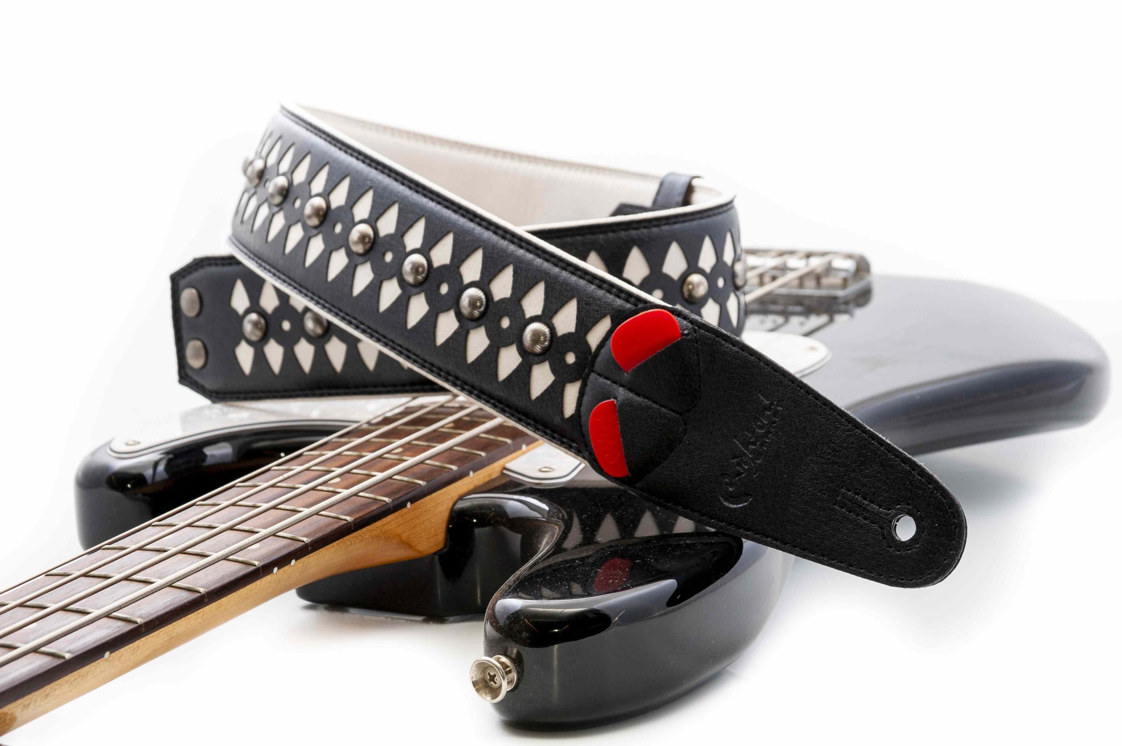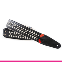 Curea de chitară cu design inspirat de armura medievală, combinând eleganța albului cu puterea metalului. Ideală pentru chitariști care caută un accesoriu rezistent, confortabil și vizual impresionant.