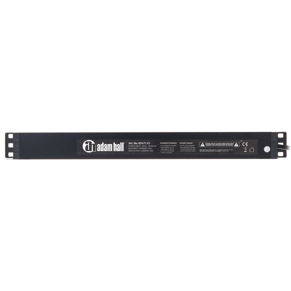 Adam Hall Power Strip 87471 X7 - Ștecher cu montare în rack de 19" oferă 7 prize rotite la 45°, previne pornirea și oprirea accidentală, și include un comutator iluminat cu capac de protecție.