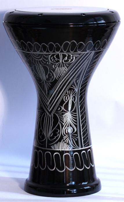 Fabricat manual în întregime din aluminiu, acest doumbek are o carcasă ornamentală gravată manual, care va impresiona prin aspectul său și sunetele rapide din Orientul Mijlociu.