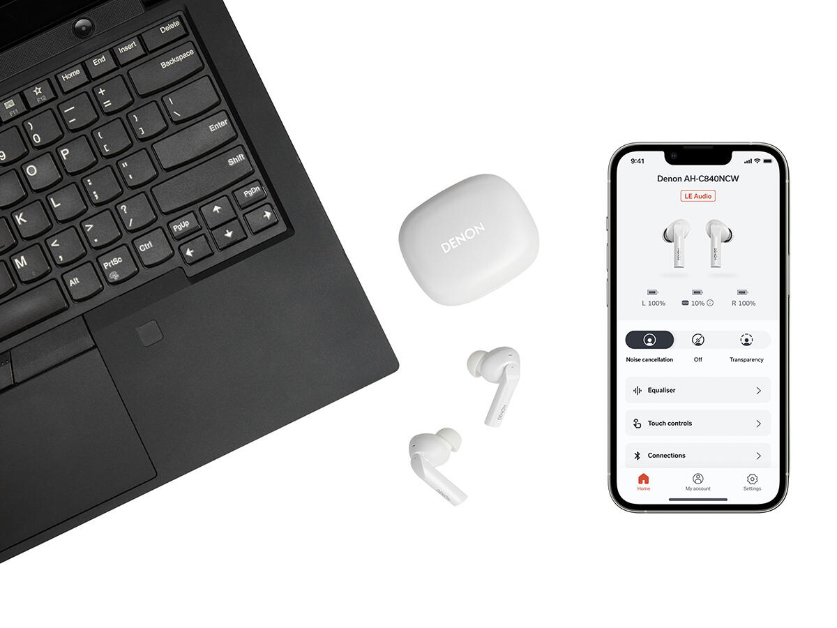 Denon AH-C840NCW - Căști true wireless in-ear, ideale pentru utilizare zilnică și activități în mișcare. Oferă conectivitate Bluetooth, anulare activă a zgomotului și autonomie extinsă cu încărcare din carcasă.