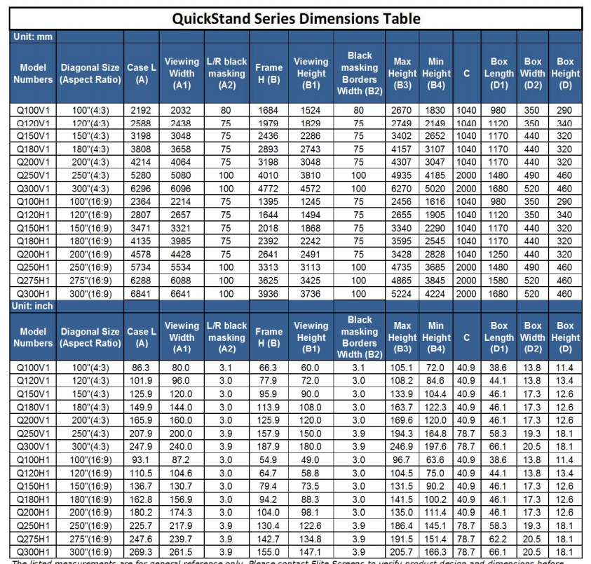 Seria QuickStand permite montarea rapida a unui ecran profesional de mari dimensiuni. Ecranul are un raport de aspect NTSC de 4:3 si inaltime ajustabila a cadrului. Dimensiunile diagonalei variaza de la 72” la 250”.