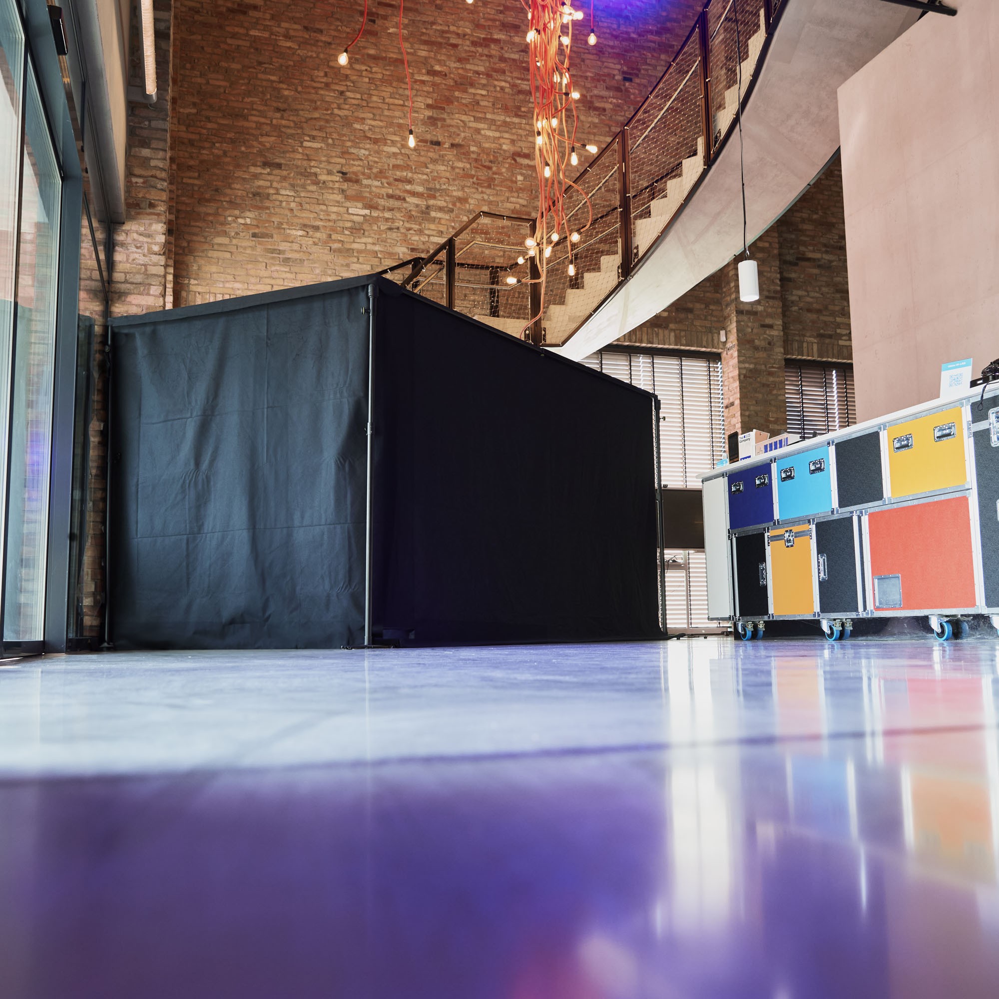 - 1 x draperie neagră 3500 x 2550 mm, ignifugă, 64% bumbac reciclat și 36% poliester