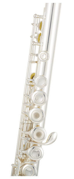 Yamaha YFL-372 GL - flaut intermediar în G (Sol), clape cu inele în sistem Offset G, mecanism pentru Mi. Corpul, îmbinarea inferioară și clapele din nickel argintat, iar îmbinarea superioară din argint de puritate standard.Muștiuc din argint placat cu aur. Greutate 1.07 Kg. Include toc și geantă de protecție și transport.