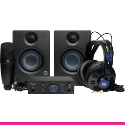 Fender Quantum Complete Bundle - Pachet complet pentru producție audio, ideal pentru muzicieni, podcasteri și creatori de conținut. Setul combină o interfață audio USB performantă, monitoare de studio, căști de studio și un microfon condensator cu diafragmă mare.