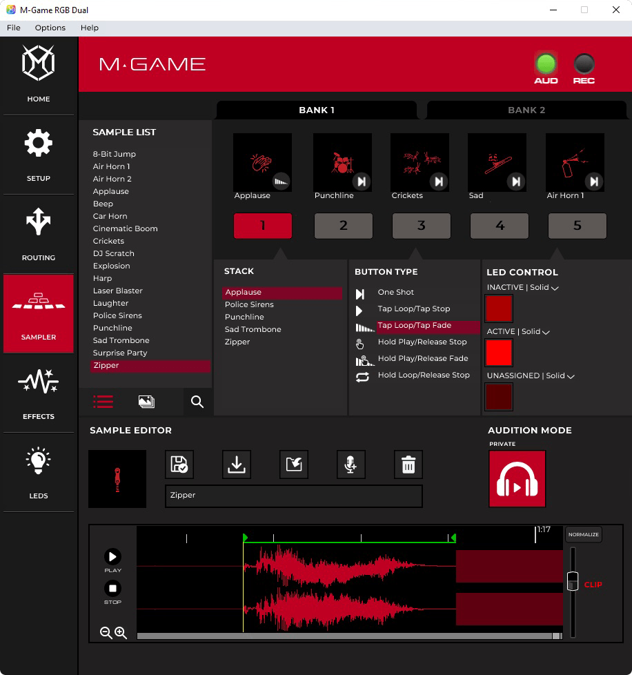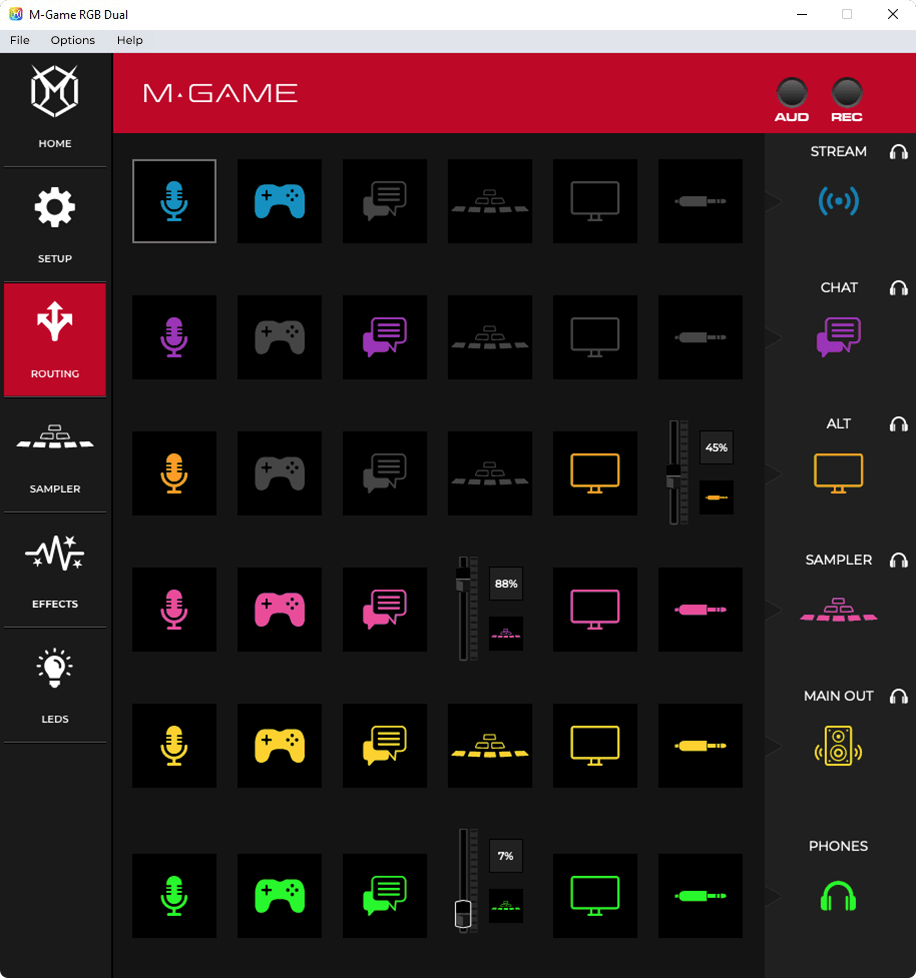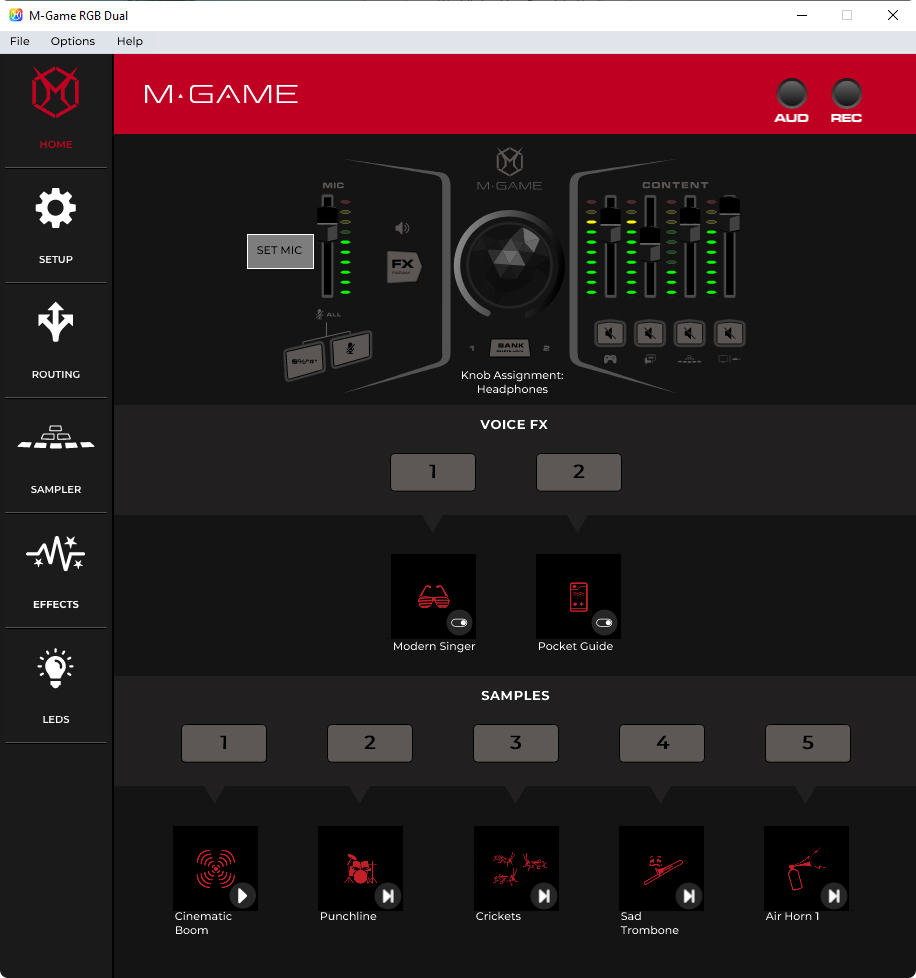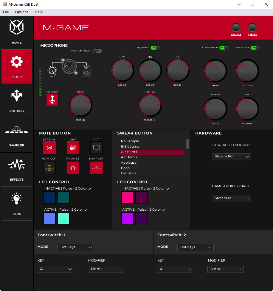 M-Game RGB Dual - Este o interfață audio/mixer de streaming USB dublă pentru PC, cu iluminare LED RGB personalizabilă, eșantionare și modelare a vocii și efecte combinate cu o interfață audio profesională și o suprafață de control fizică a mixării.