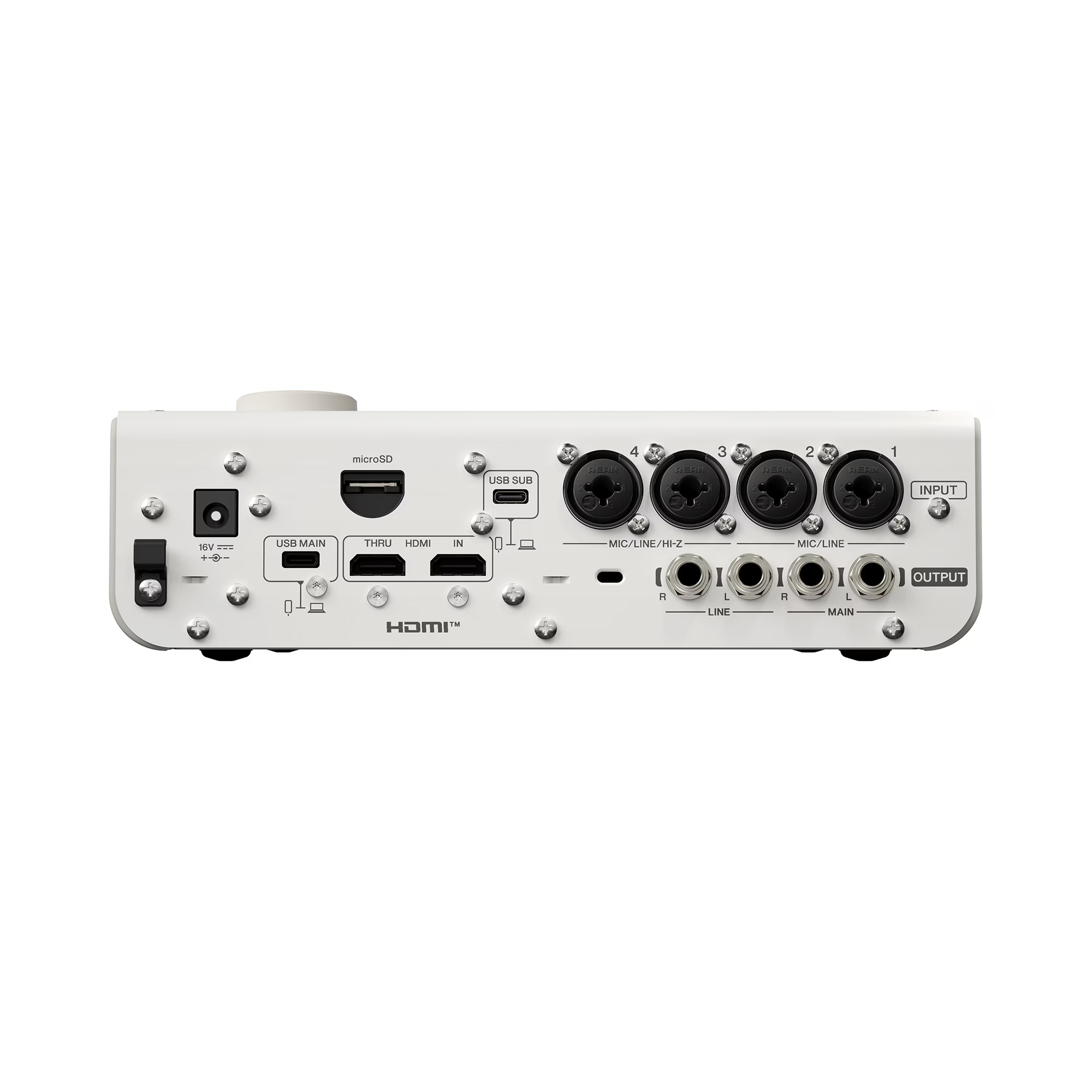 Yamaha URX44V WH - Interfață Audio/Video USB-C 6-in / 4-out cu DSP și HDMI. Această interfață audio-video USB-C oferă conversie audio 32-bit / 192 kHz, procesare DSP avansată, control tactil intuitiv și integrare video HDMI, fiind ideală pentru producție audio, streaming, podcasting, creație de conținut, înregistrări multitrack și workflow-uri AV hibride.
