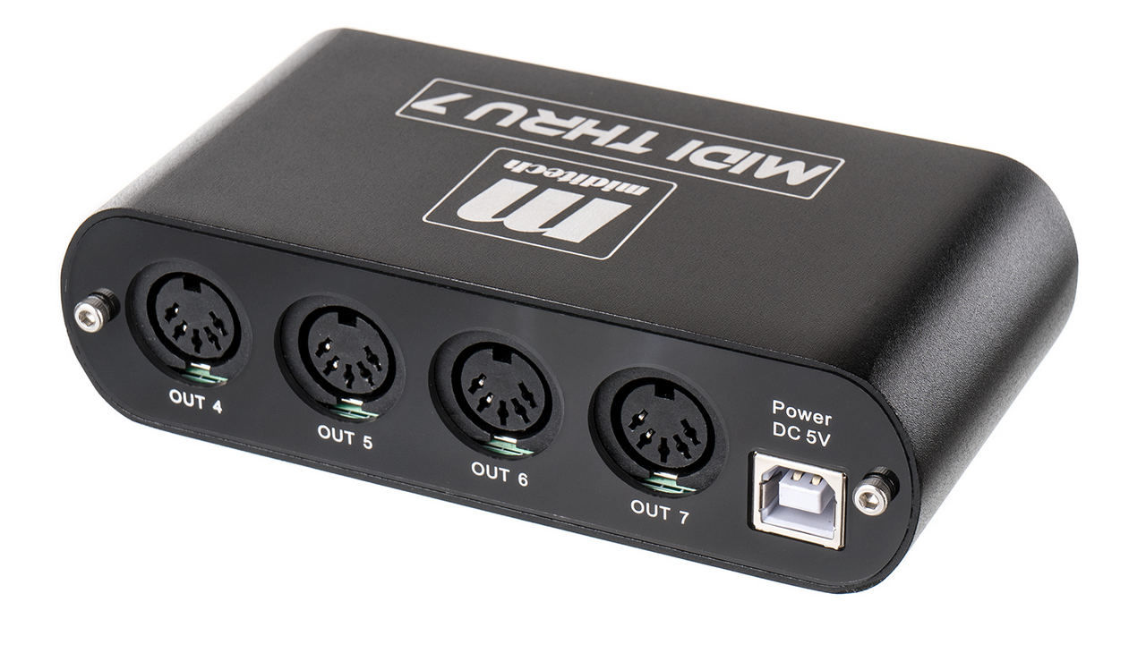 Interfață MIDI thru ce multiplică semnalul MIDI de intrare la 7 ieșiri, pentru alimentarea unității aveți nevoie de un cablu adaptor USB DC (neinclus in pachet).