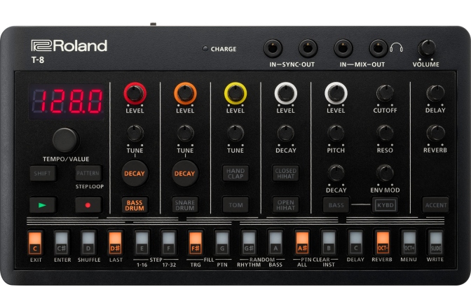 Roland T-8 Beat Machine - Mașină de ritm cu design ultra portabil echipată cu sunete autentice Roland derivate din legendarul model TB-303. Are o construcție solidă cu pad-uri din cauciuc și se alimentează cu ajutorul unei baterii Lithium-ion cu autonomia totală de până la 4.5 ore pe încărcare.