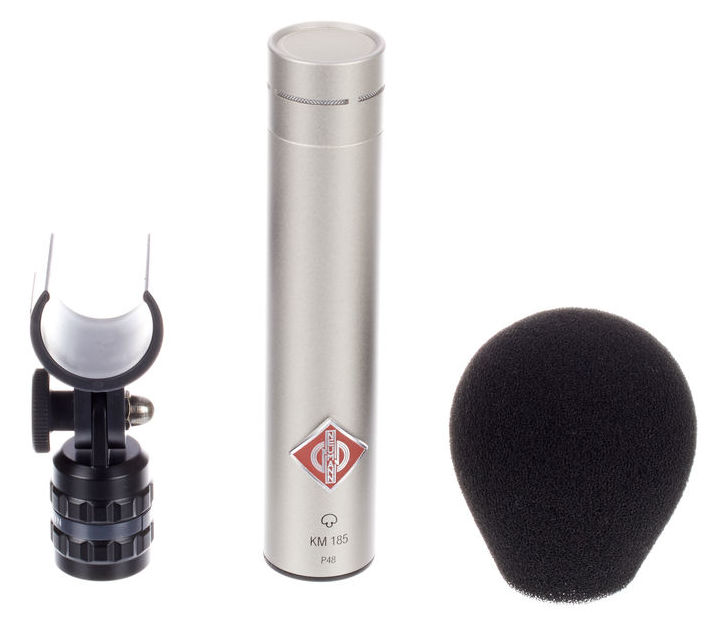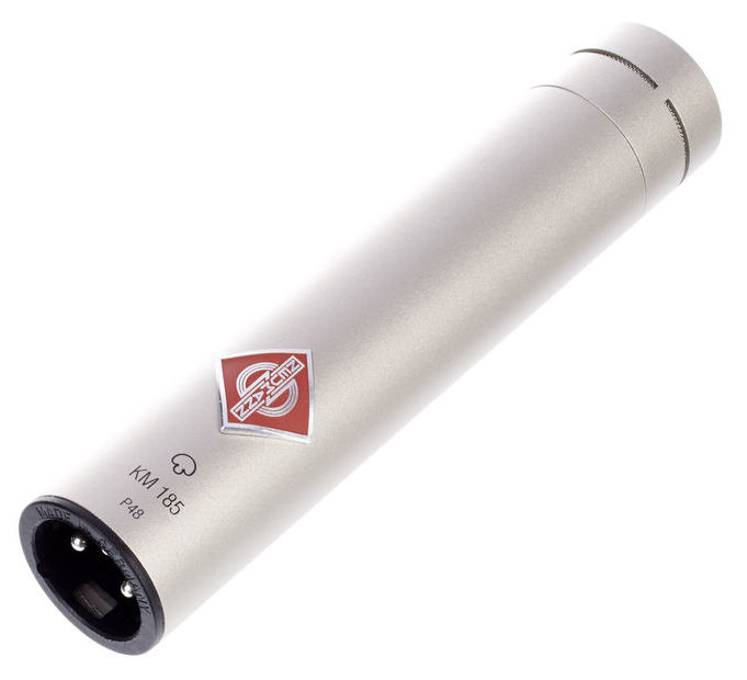 Neumann KM 185 - microfon cu diafragmă mică și caracteristică polară hiper-cardioidă, bazat pe circuit fără transformator. Alimentare Phantom power +48 V, răspuns în frecvență 20 Hz - 20 kHz. Ideal pentru a fi folosit pentru înregistrări X,Y and ORTF. Funcționează in condiții optime și la presiuni ale sunetului de pînă la 142 dB, permițând captare de sunet de apropiere de la surse cu volum înalt. Ideal ca microfon de broadcast, overhead pentru tobe, instrumente cu corzi și arcuș, percuție, pian, cabinete și boxe de instrument. Se livrează cu windshield WNS100 și montura pentru stativ de microfon SG21. Finisaj nickel.
