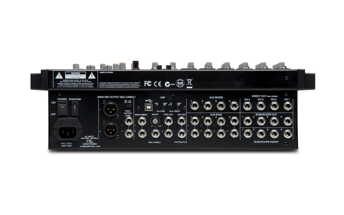 Mixer audio analogic cu 8 canale, 6 canale mono de microfon/linie și 2 canale stereo duale, EQ pe 3 benzi pe fiecare canal, 4 trimiteri auxiliare / canal, procesor de efecte Alesis, 4 subgrupe, USB
