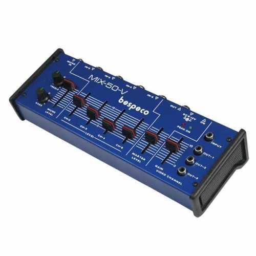 Mixer compact/sumator cu 5 canale, 5 intrari mono de linie (Jack) si o intrare de microfon (Jack), EQ pe 2 benzi, 1 x intrare video RCA si 3 iesiri RCA video