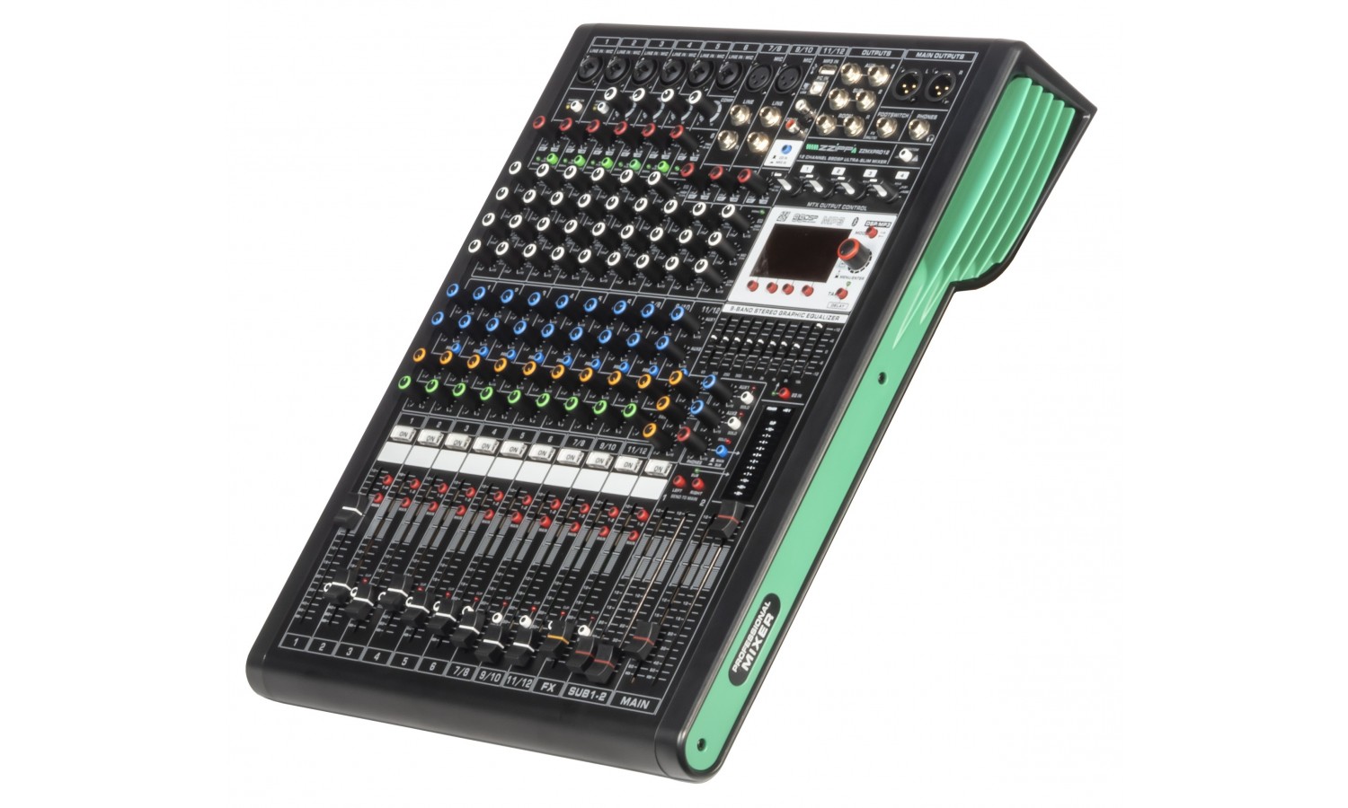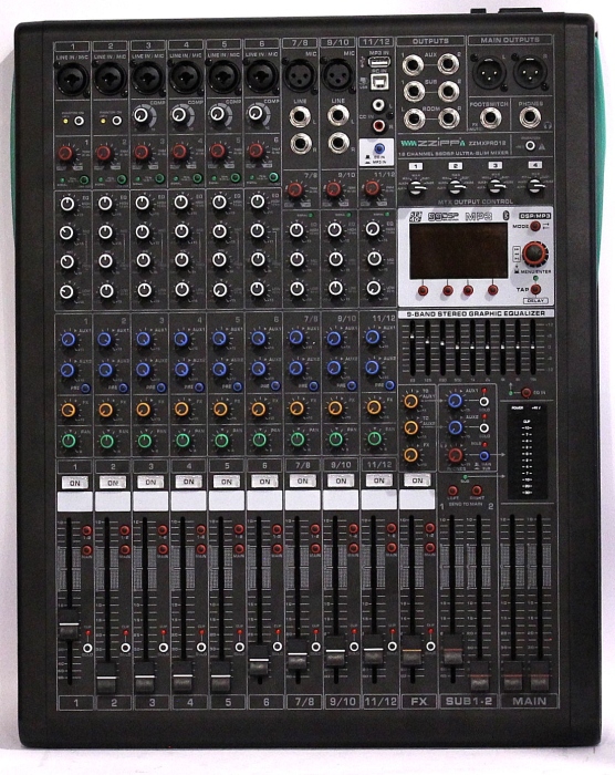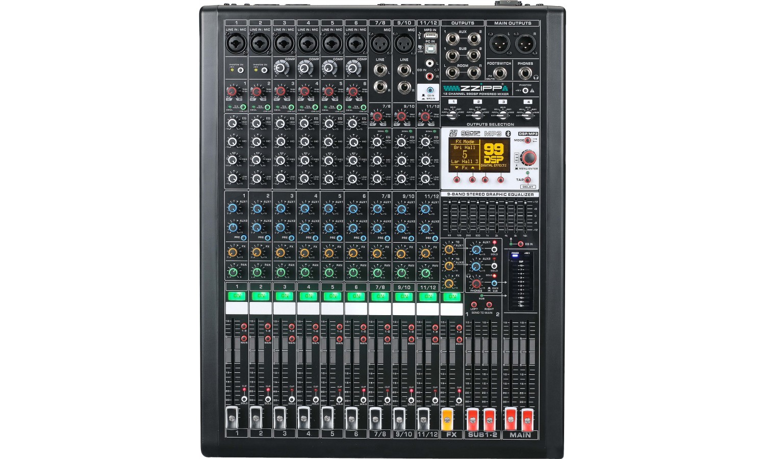 Zzipp ZZMXPRO12 - Mixer analogic compact cu DSP de 32 de biți încorporat și placă de sunet full duplex, 99 de efecte, conectivitate bluetooth și player media, 4 grupuri de ieșiri auxiliare selectabile independent, cu selector matrice, EQ cu 9 benzi pe master, phantom power +48V.