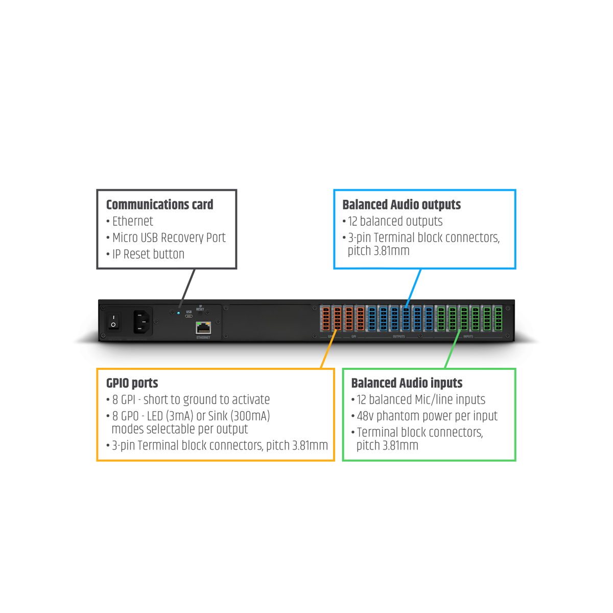 • Ieșire audio: 12 ieșiri de linie echilibrate